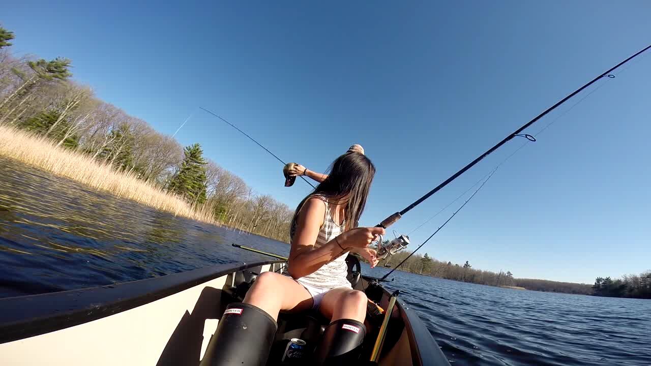 A man and woman fish from a canoe outdoors on a lake. The man swings his rod to cast and hooks the woman's hat, pulling it off of her head. Action: 1:15