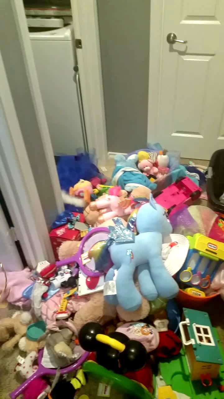 A tot girl cleans her room and excitedly shows her mom. Her mom sees that the girl threw all her toys into the hallway. The girl smiles and yells "I cleaned" and her family laughs.