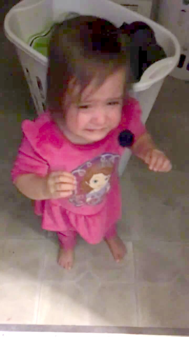 A young girl cries in the living room when her mother tells her there is no school on Saturday, and says "Okay" when she tells her she will go to school on Monday.