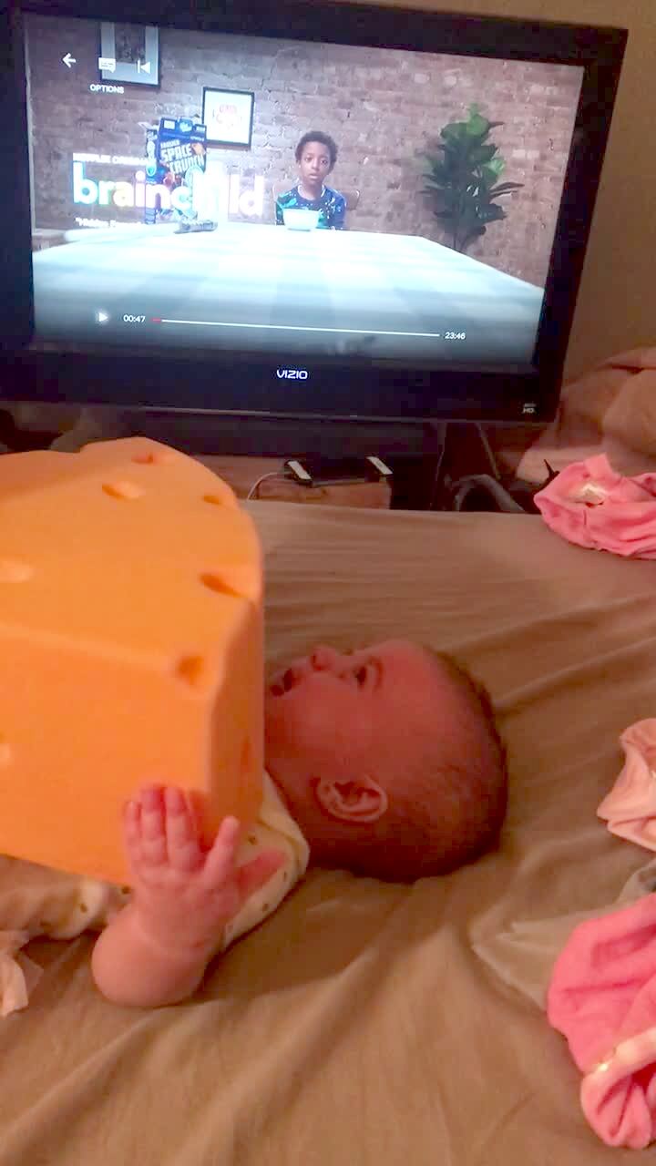 A woman tells her young son and tot son that there is a baby in her belly and the tot boy asks her if she ate it.