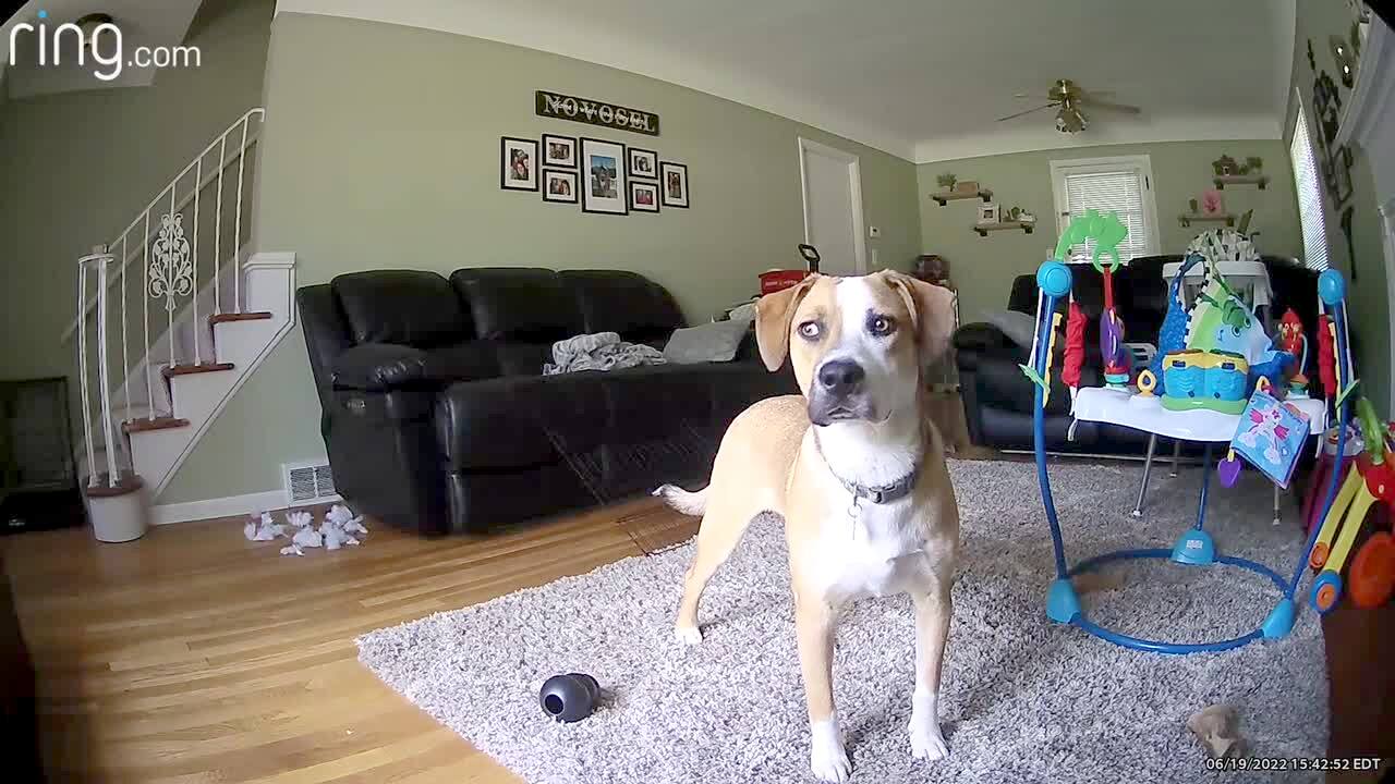 A baby boy in a living room plays with a picture frame on a table. The woman with the camera tells him no and he turns around and gives her a cheeky look. He accidentally knocks the picture frame over and turns around and looks shocked.