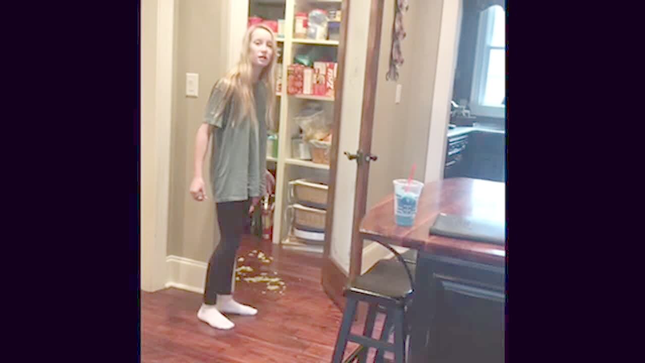A man hides a taxidermied raccoon in the kitchen pantry to prank his teen daughter. The girl goes into the pantry to get her dad a snack and then gets scared and runs out of the pantry when she sees the raccoon.