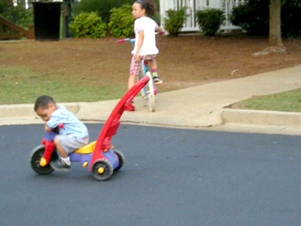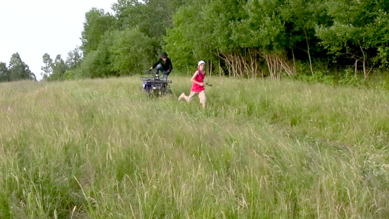 A young boy does not turn off an ATV and it drives over another young boy, who the first boy is chasing. No recovery. Could be Forbidden.