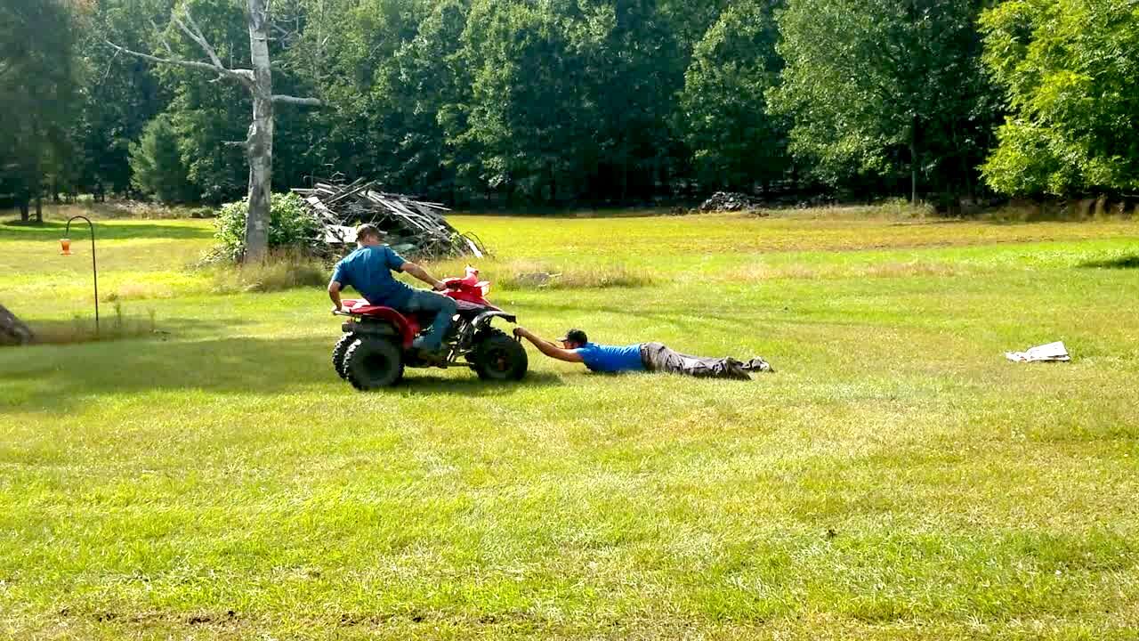 A man holds on to the front of an ATV while his friend drives it backwards in circles.