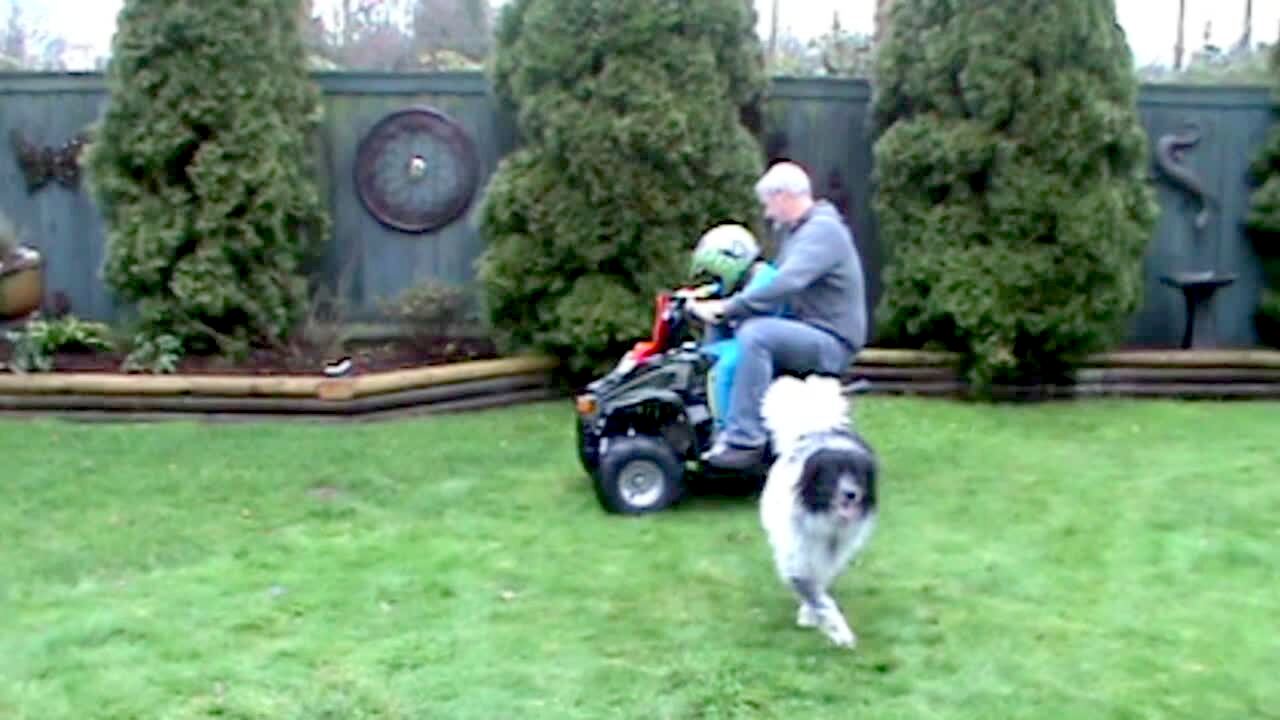 Young boy rides a four wheeler for the first time and crashes into a fence. Grandpa is sitting behind him on the ATV and they both flip over the handlebars.