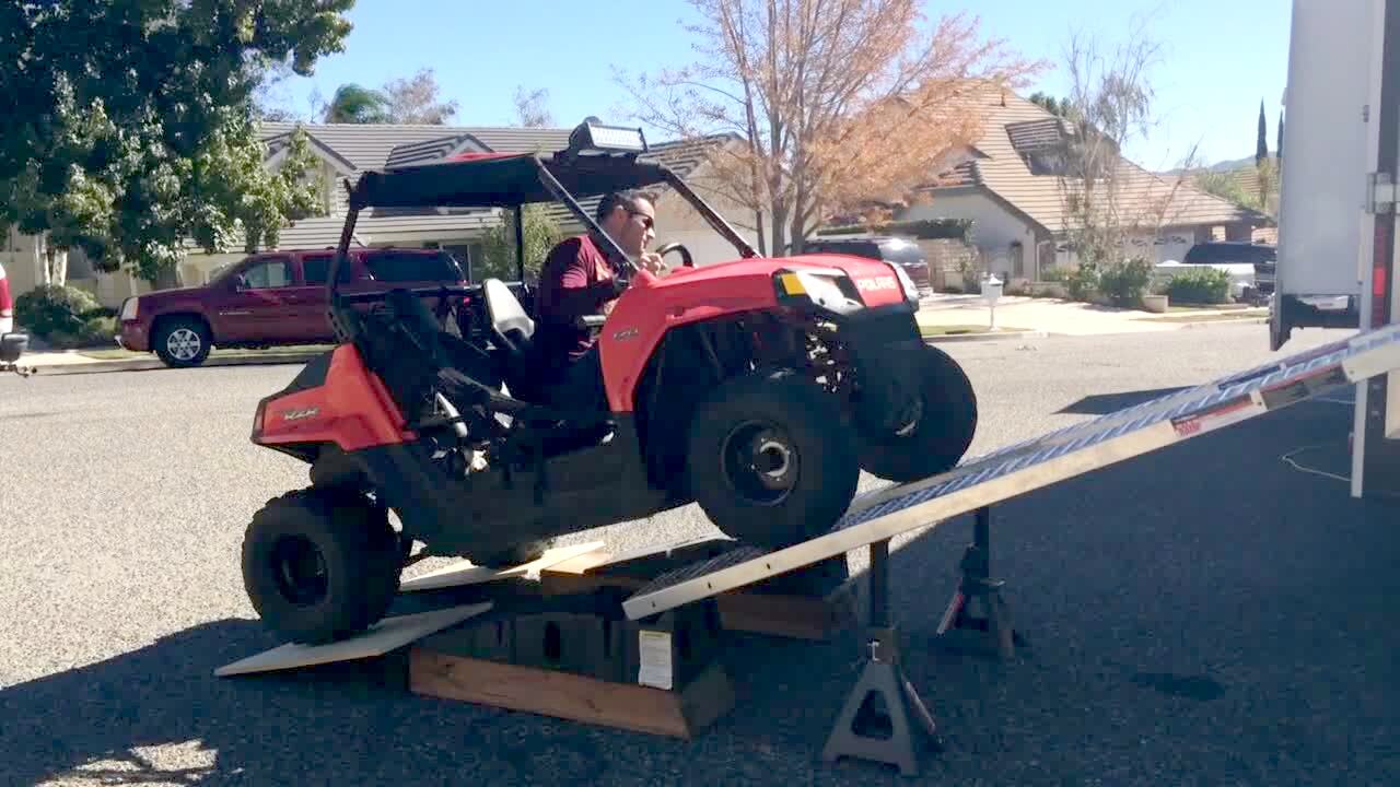An adult man tries to drive an ATV up a homemade ramp but the ramp breaks and the vehicle falls back outdoors.