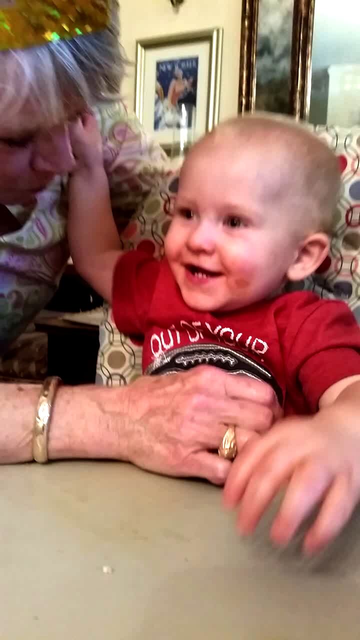 "Baby Sneaks a Peek" - A baby boy looks down a senior woman's shirt and says "wow."