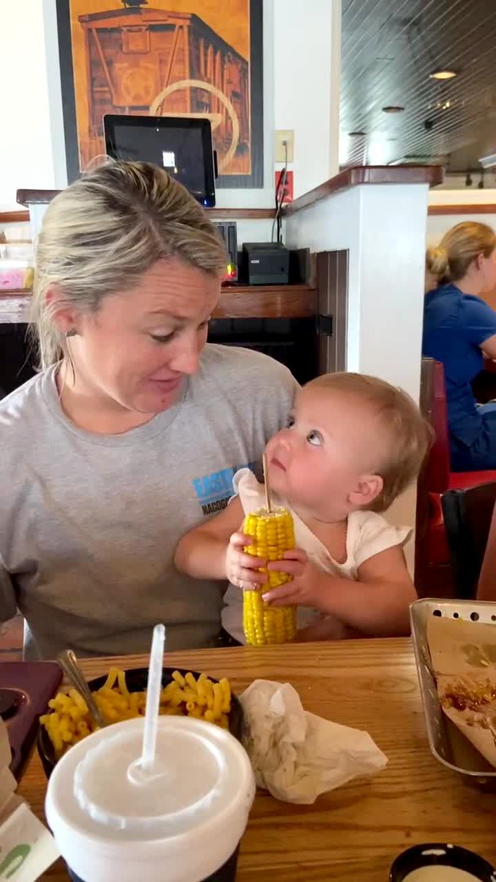 At a restaurant, a baby girl does not want to share her corn on the cob with her mother. The baby shouts at her, takes it back then shakes her head at the woman. Featured talent clear (the woman and the baby in her arms).