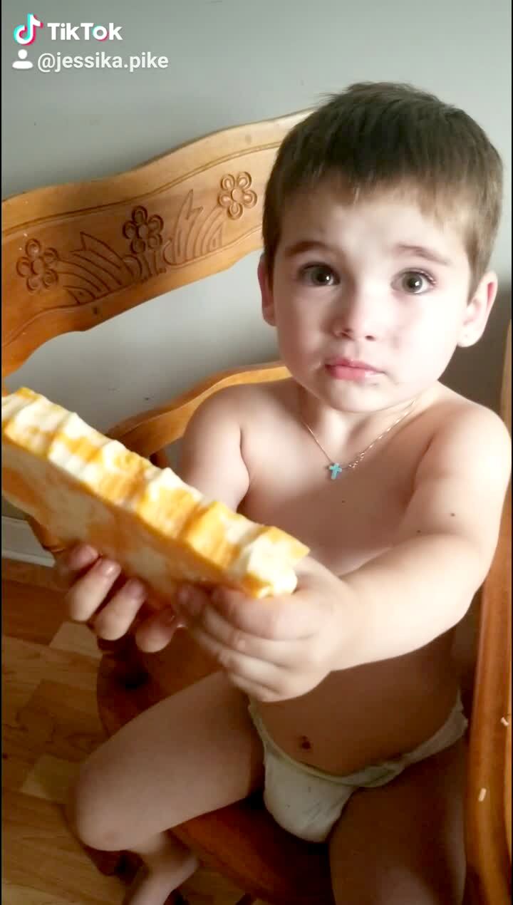 The woman behind the camera says "what did you do" to her tot son while he holds out a large block of cheese with some bites taken out of it in the kitchen. The boy says "I'm sorry, mom, I'm your best friend."