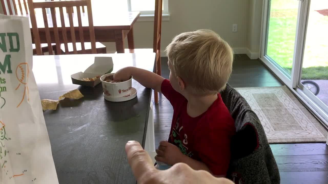 A tot boy sits with his hand in a cup of refried beans. His mom tells him to take his hand out, but he pretends not to understand her. He finally takes his hand out of the beans, but he immediately puts it back in.