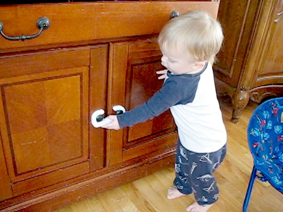 Tot boy opens a childproof locked cabinet. He makes a cute face when he gets the door open.
