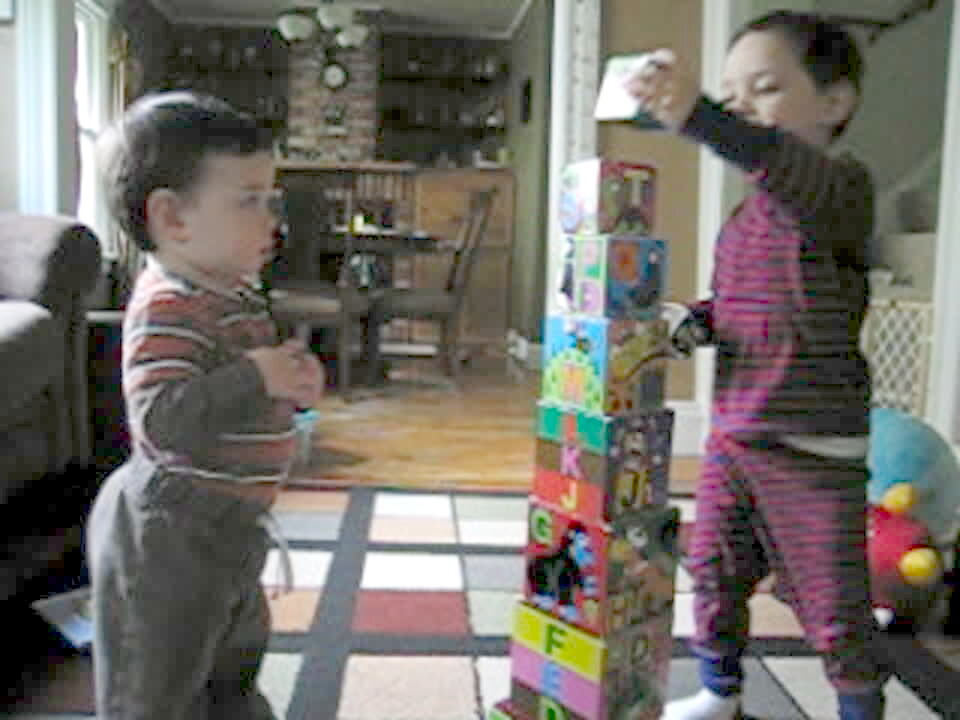 A young boy builds a tower for his tot brother to knock down. The tot boy won't knock the tower down so the young boy pushes his tot brother into the tower when his mother says to help him.