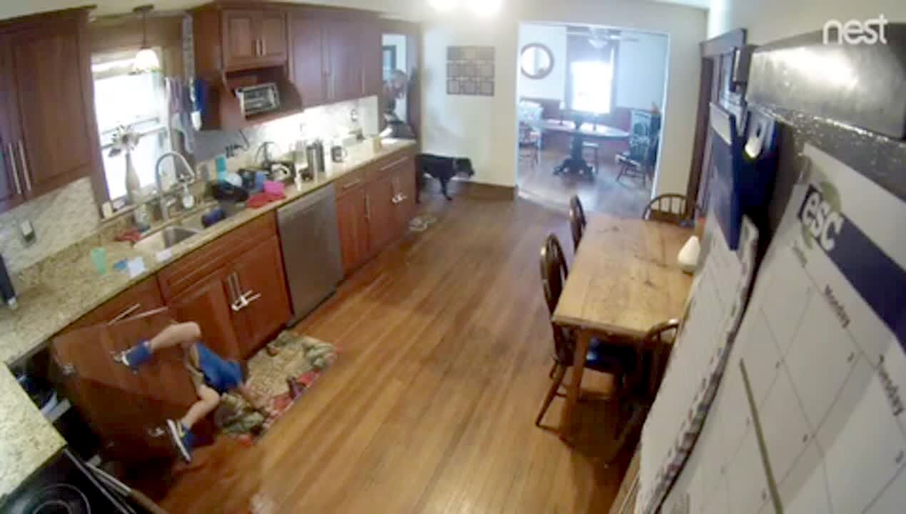 Security camera footage of a young boy who jumps down from the kitchen counter, but his belt loop gets caught on a cabinet, so he gets stuck on it and hangs upside down until his mom comes over to help him get down.