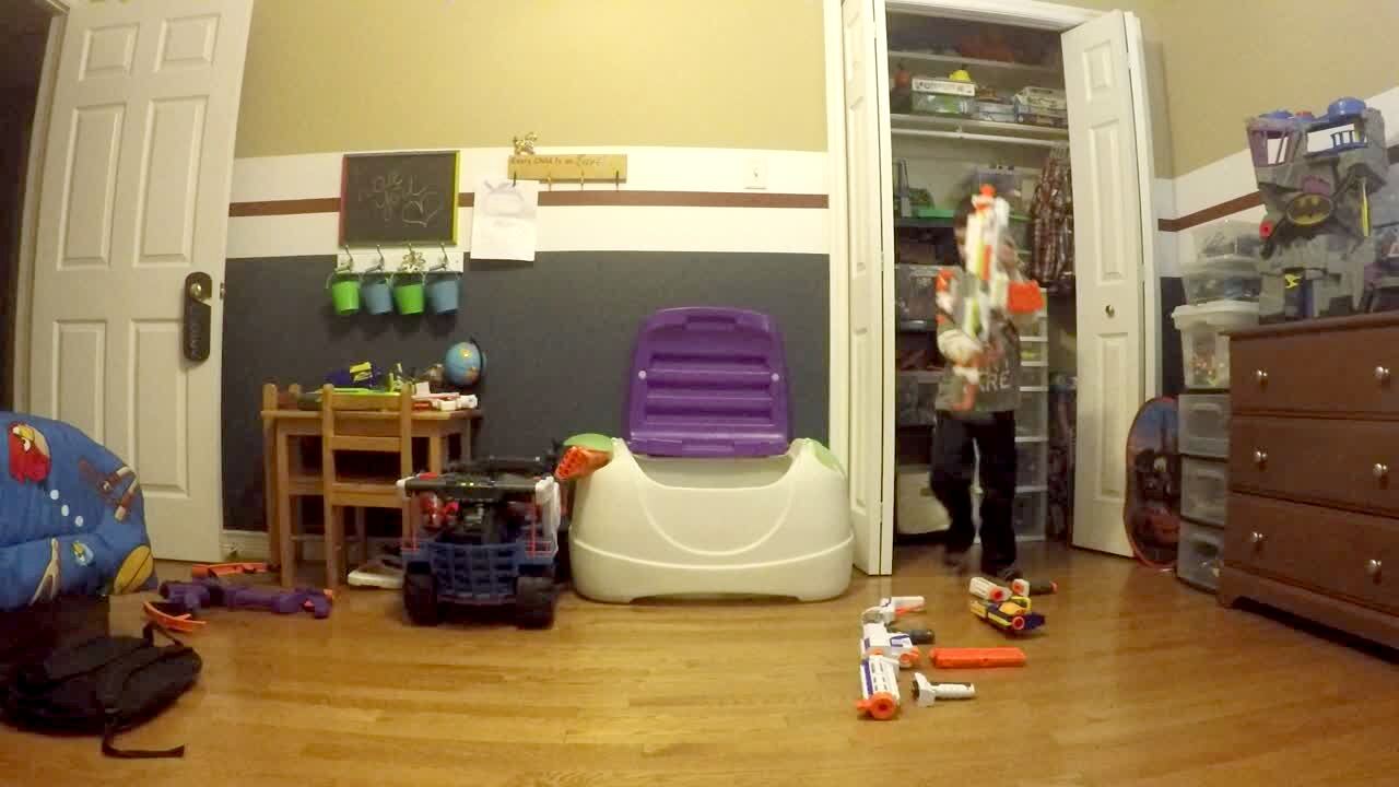 A young boy shows off his toy guns. At 3:20 the boy falls in to his toy box and the lid closes on him.