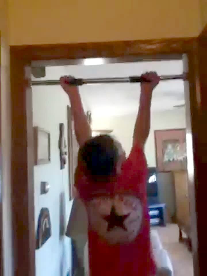 A boy jumps up to do a pull up on a bar across a doorway at home and falls when the bar comes down.