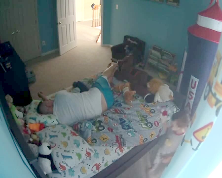 A man is fast asleep on a young boy's bed. The boy walks in and throws a toy at his back and hides. The man doesn’t respond to this, the tot boy comes out and starts to walk towards the man. The man throws a pillow directly in his face. They both laugh. Security footage.
