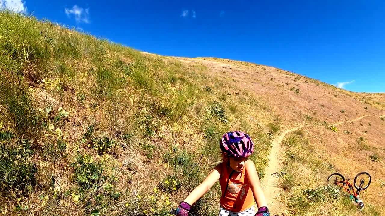 A family rides their bicycles through the mountains when a woman falls and slides down the hill. Her husband tells her to stay where she is.