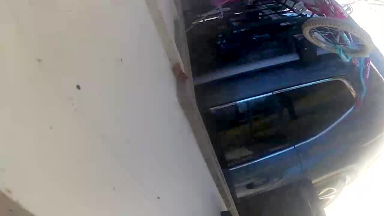 A car pulls into a garage with bicycles on a roof rack, then the bicycles hit the ceiling and the car pulls out again. Security footage.