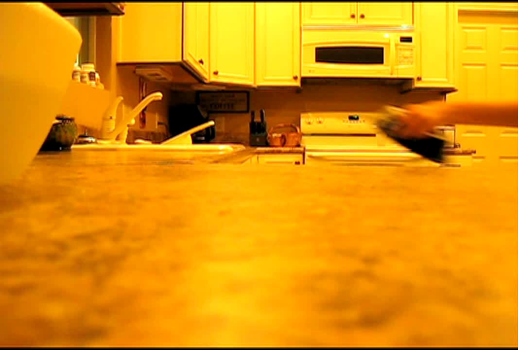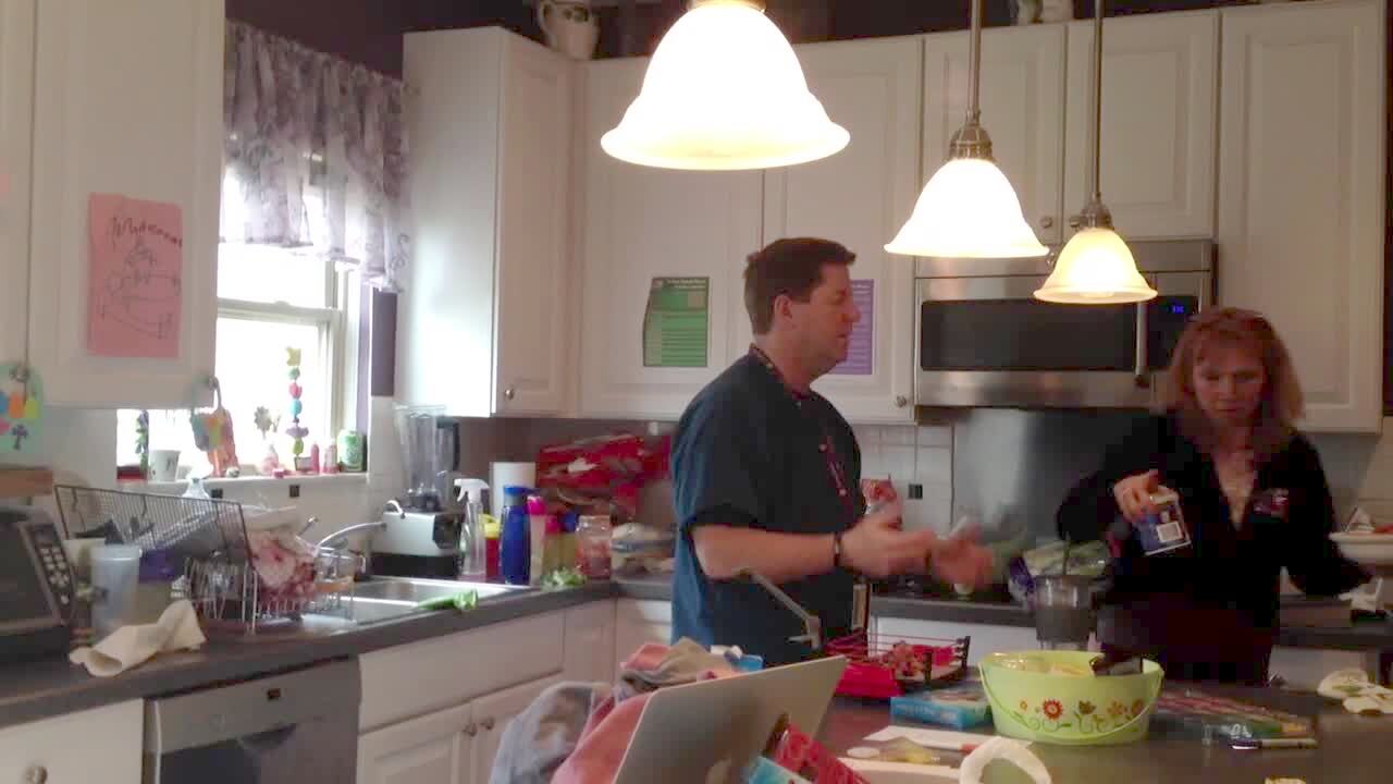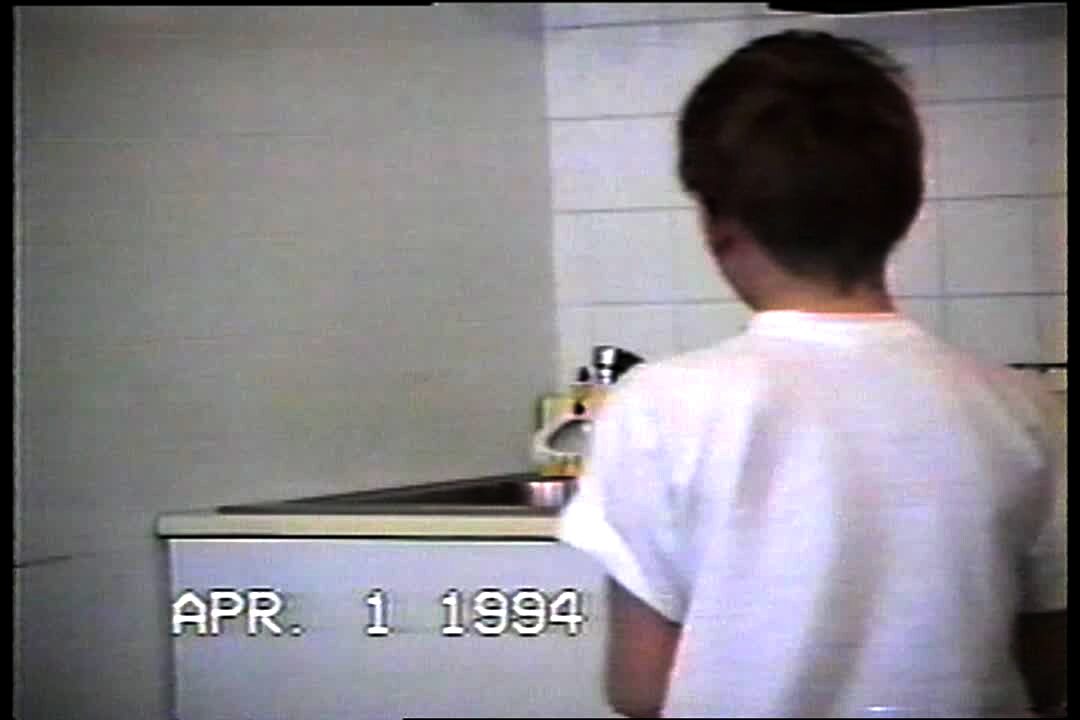 Boy gets sprayed by the kitchen sink faucet. He says "What the..." Practical joke.