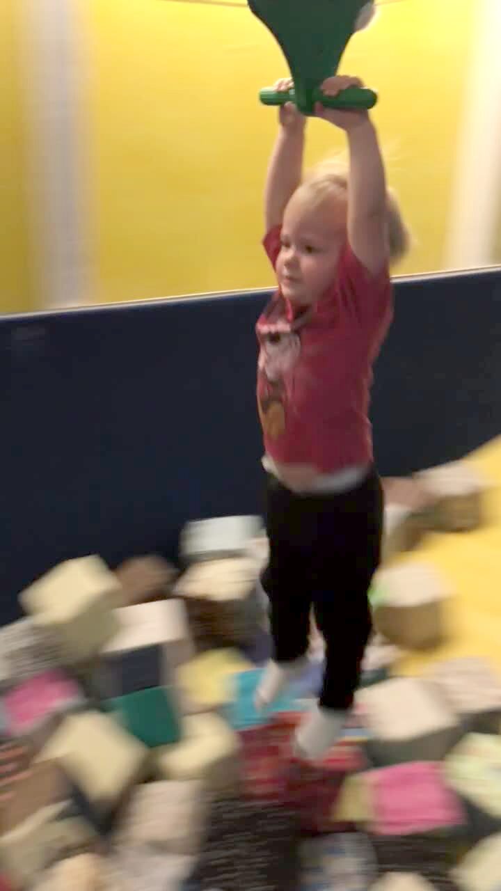 A teen boy tries to jump off the end of a pier but gets stuck on a rope and hangs above the water.