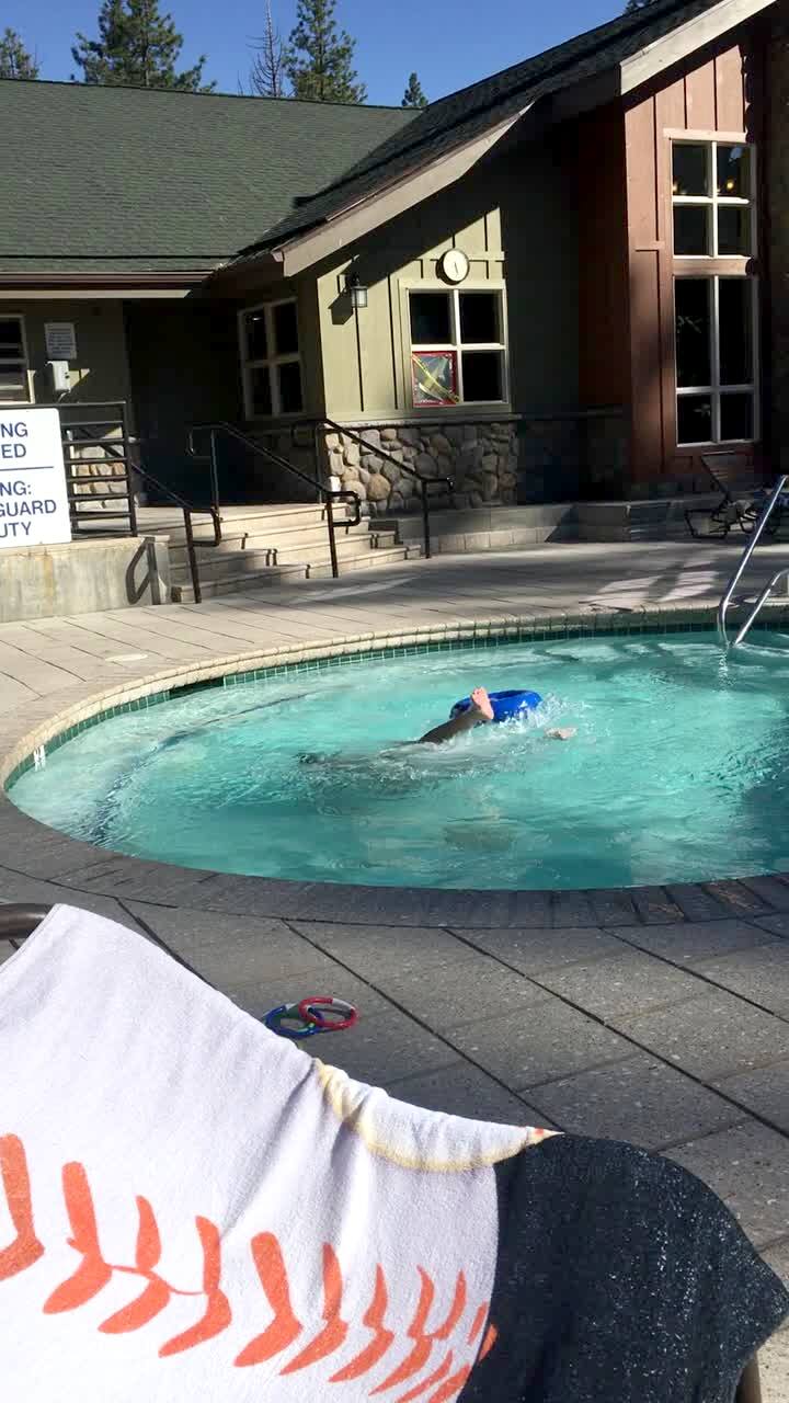A teen boy runs in the yard and jumps to get into an above ground pool, but he hits his stomach right against the wall.