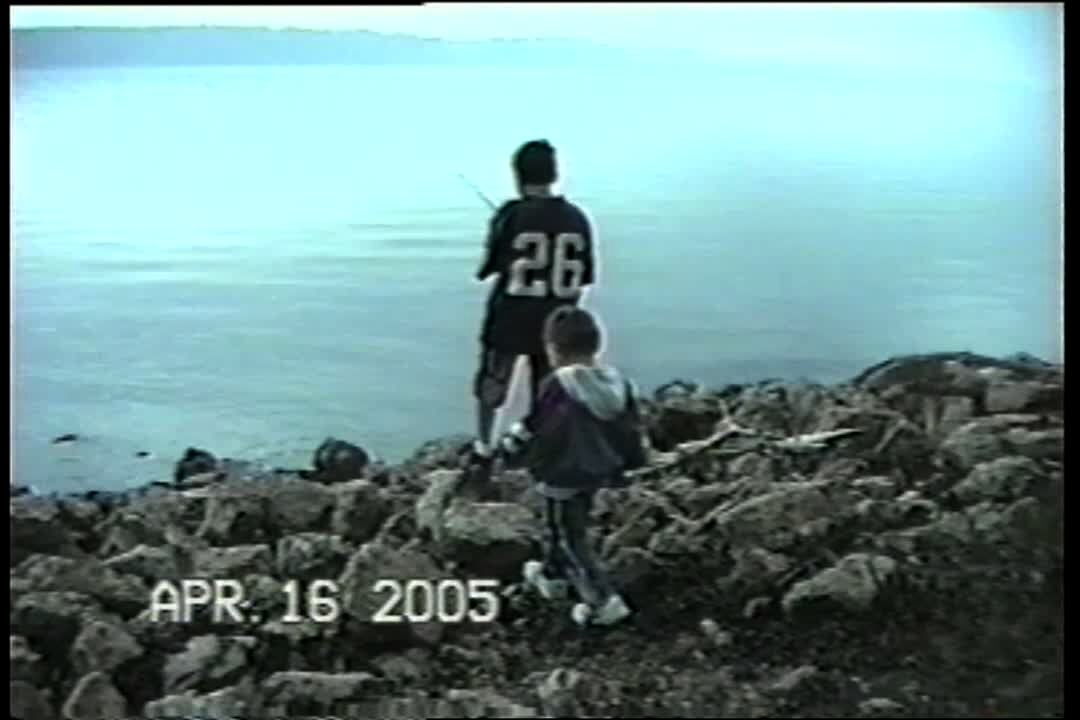 Boy tries to cast fishing pole in lake while younger boy watches. It slips out of his hands, falls into the water. Brothers both look at their mom worried.