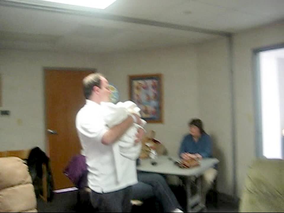 Dad holds newborn baby boy in hospital & shows Grandma. Man pretends to drop baby, senior woman slaps him.