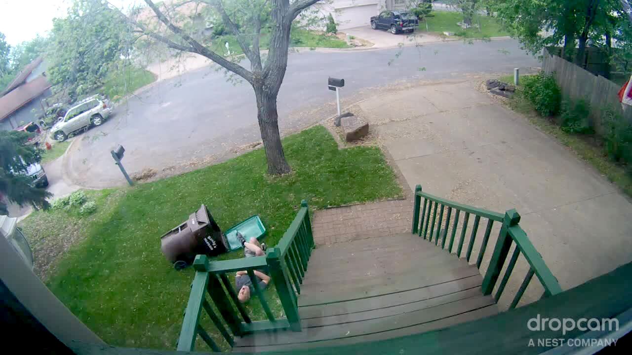 A young boy stands outside the open window and sprays a hose at a woman in her bedroom. His irate mother yells at him to stop.