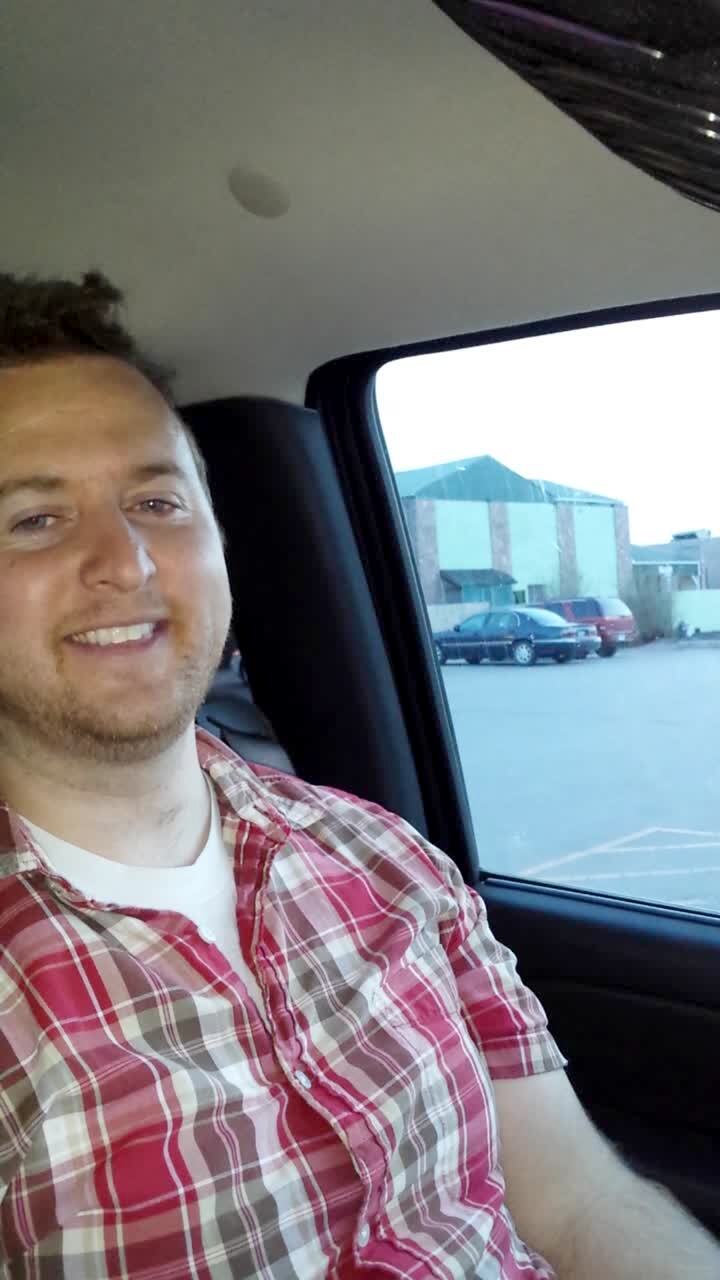 A young girl in the backseat of a car waves out the window to a man she knows driving an SUV in the lane next to her. She yells "I've got to tell you something: I farted!"