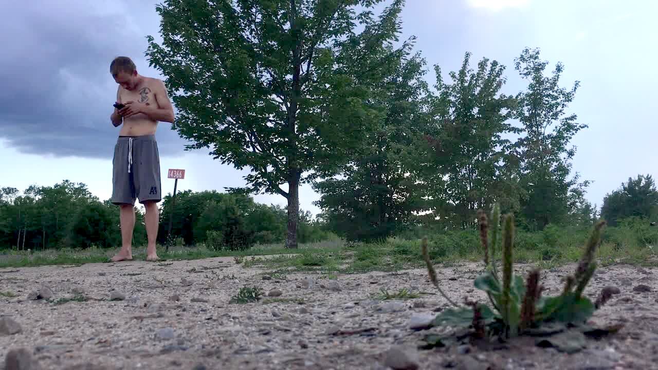 Raccoon walks up to man filming it in the wood and opens its arms out. Looks like raccoon wants a hug.