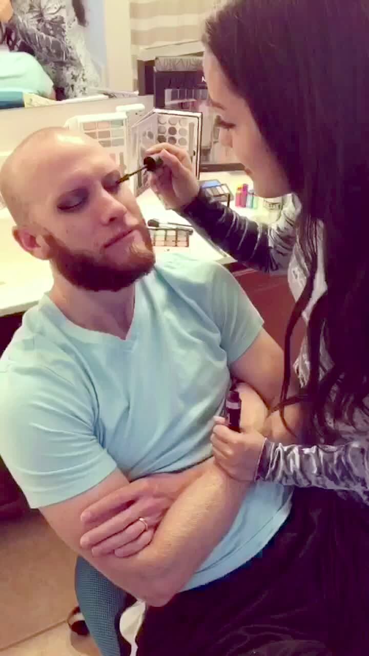 Man holds a pet raccoon on his lap on the porch, tells it not to peek or it'll see a naked woman. Raccoon covers its eyes.