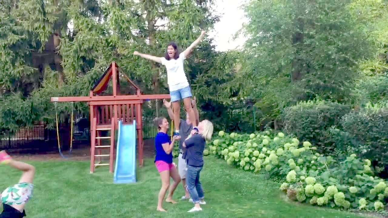 Two women hold a third woman up like a cheerleader in the yard and the woman on top loses balance and falls over and the two women under her fall too.