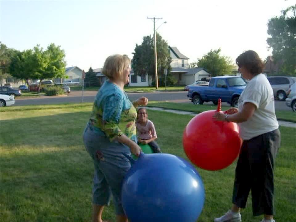 2 women hit each other with large exercise balls outdoors. They slowly bounce into each other, hit heads and fall to the ground laughing.