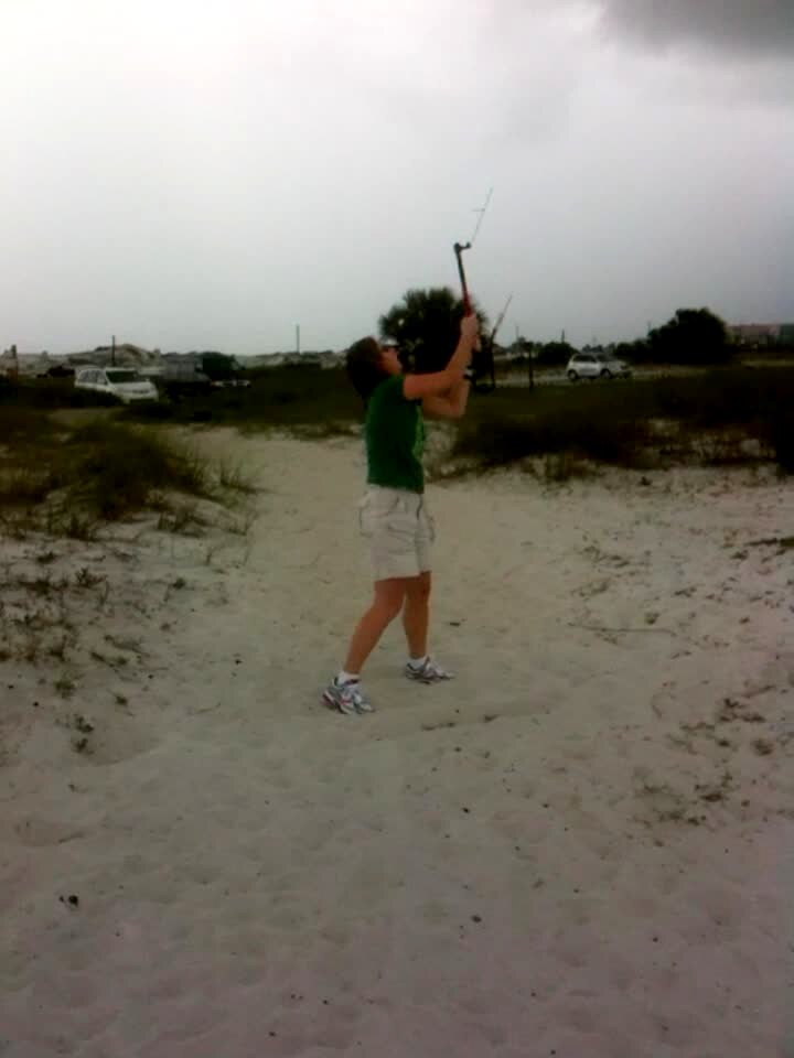 Woman tries to kitesurf on beach on a windy day and is yanked and dragged through the sand.