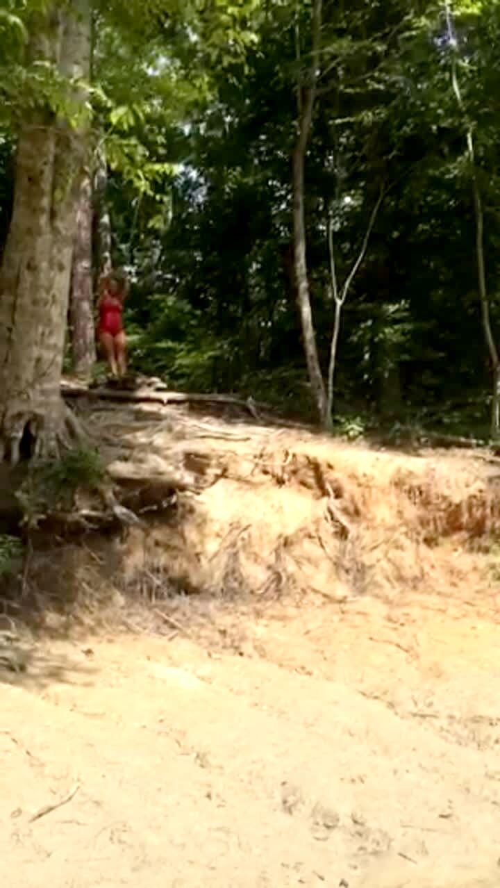 A woman swings from a rope swing over water outdoors, falls onto the beach, lands on her knees, and skids into the water. Short tail