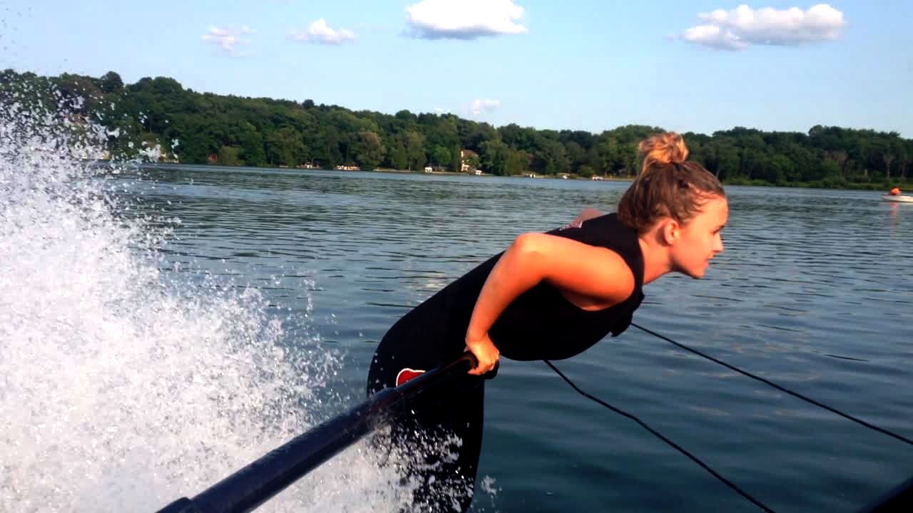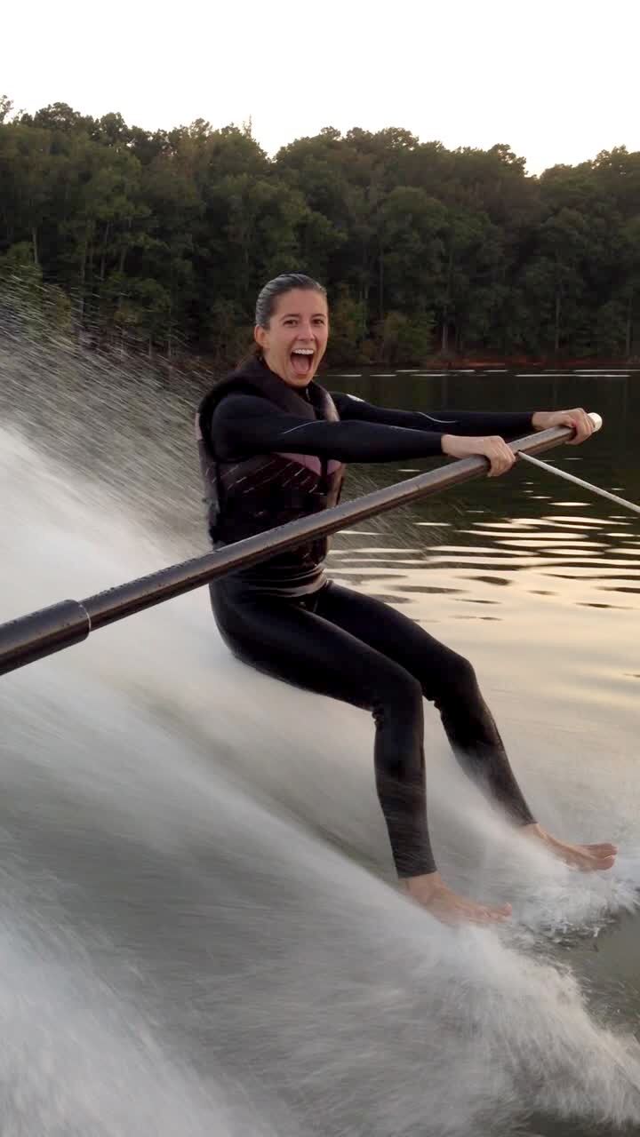A woman hangs on a pole on the side of a speed boat on a lake outdoors, skims the water on her bare feet, waves to the camera, and falls in.
