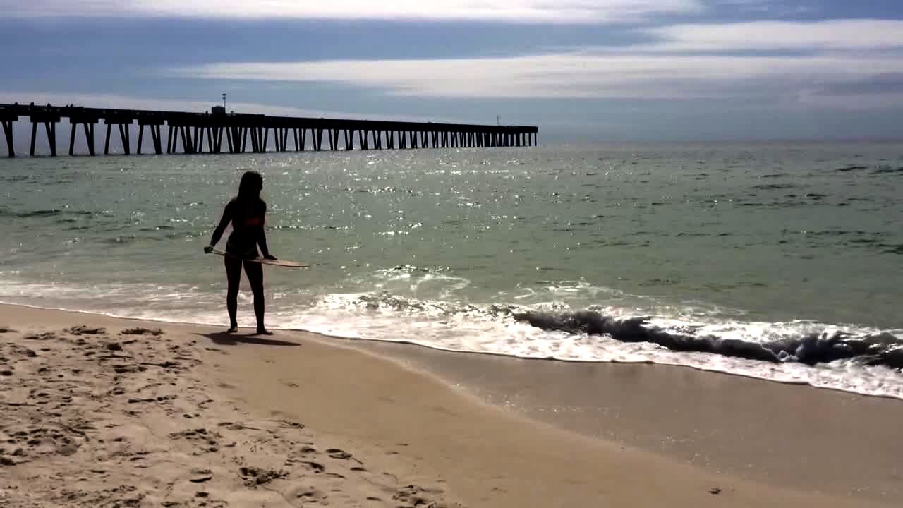 A woman is posing for pictures on a beach. A wave rolls in and soaks her at 0:08.