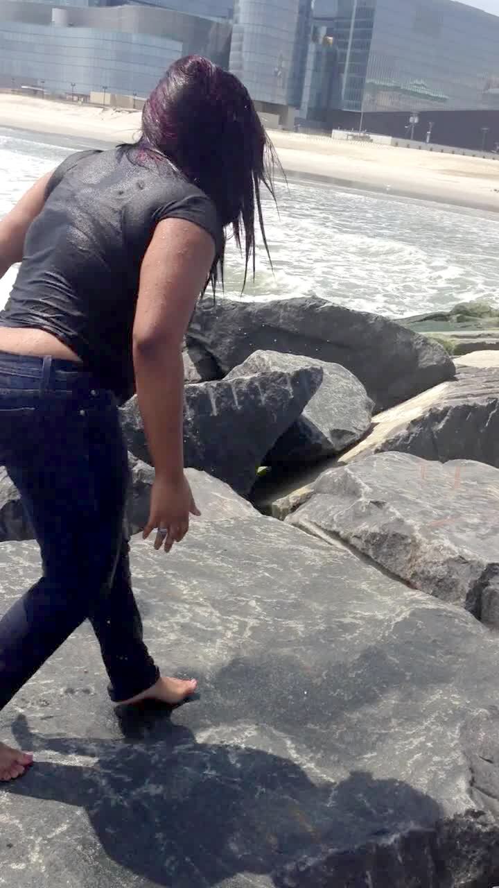 A young woman poses for a picture on a rock on a beach. A large ocean wave rolls in behind her and splashes her hard.