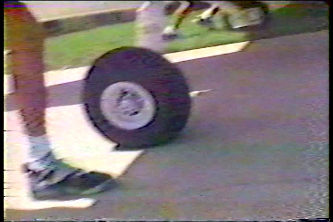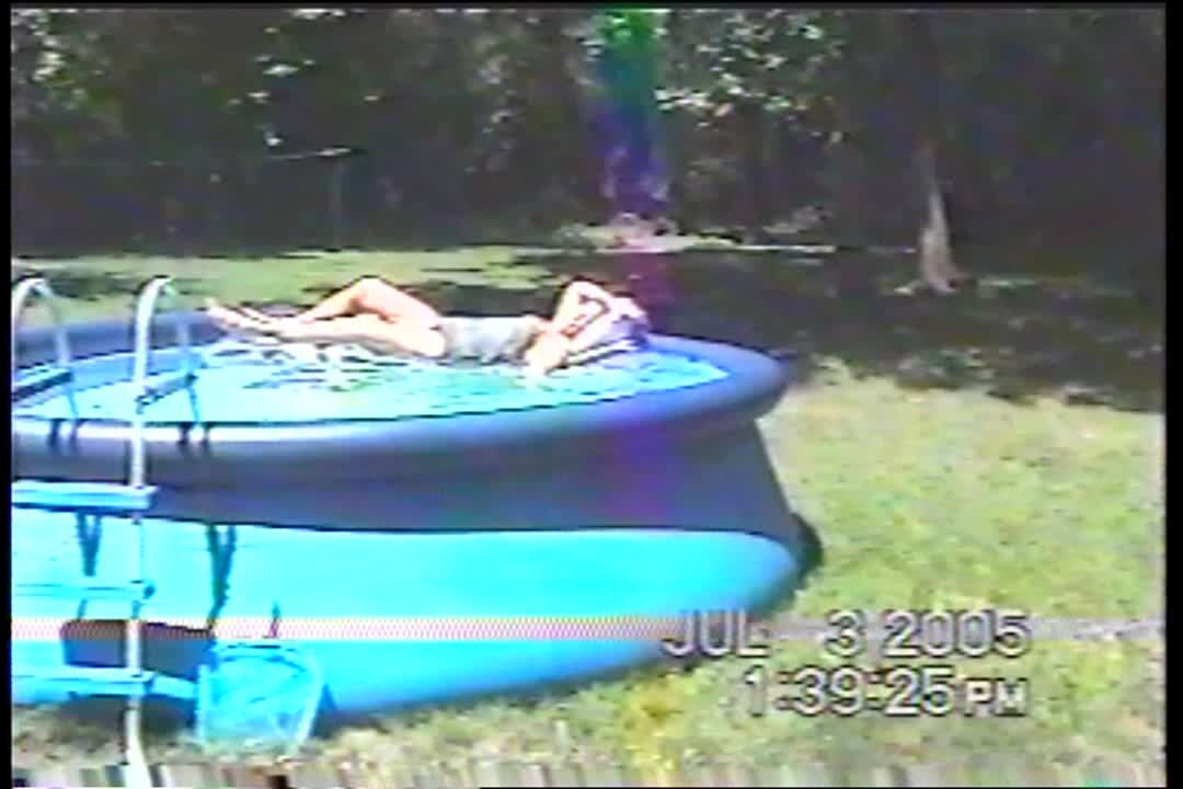 Woman lays on raft in big inflatable pool. Pool is too full of water & she floats right over the edge, falls onto ground. Summer.