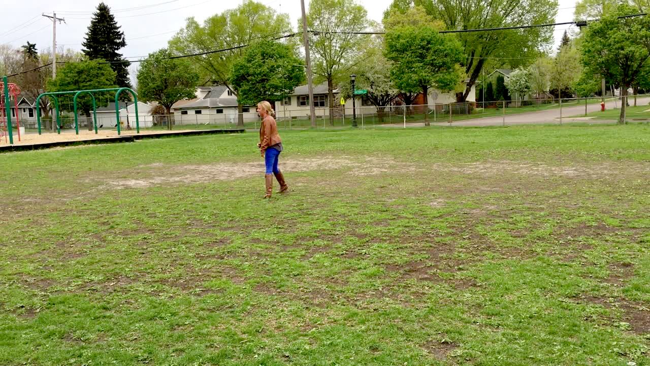 A tot girl carries a stool out of the house and her mom follows her with the camera and asks what she's going to do with it. The woman follows the girl as she takes the stool and puts it in front of a fence and stands on it so she can talk to a young boy on the other side of the fence.