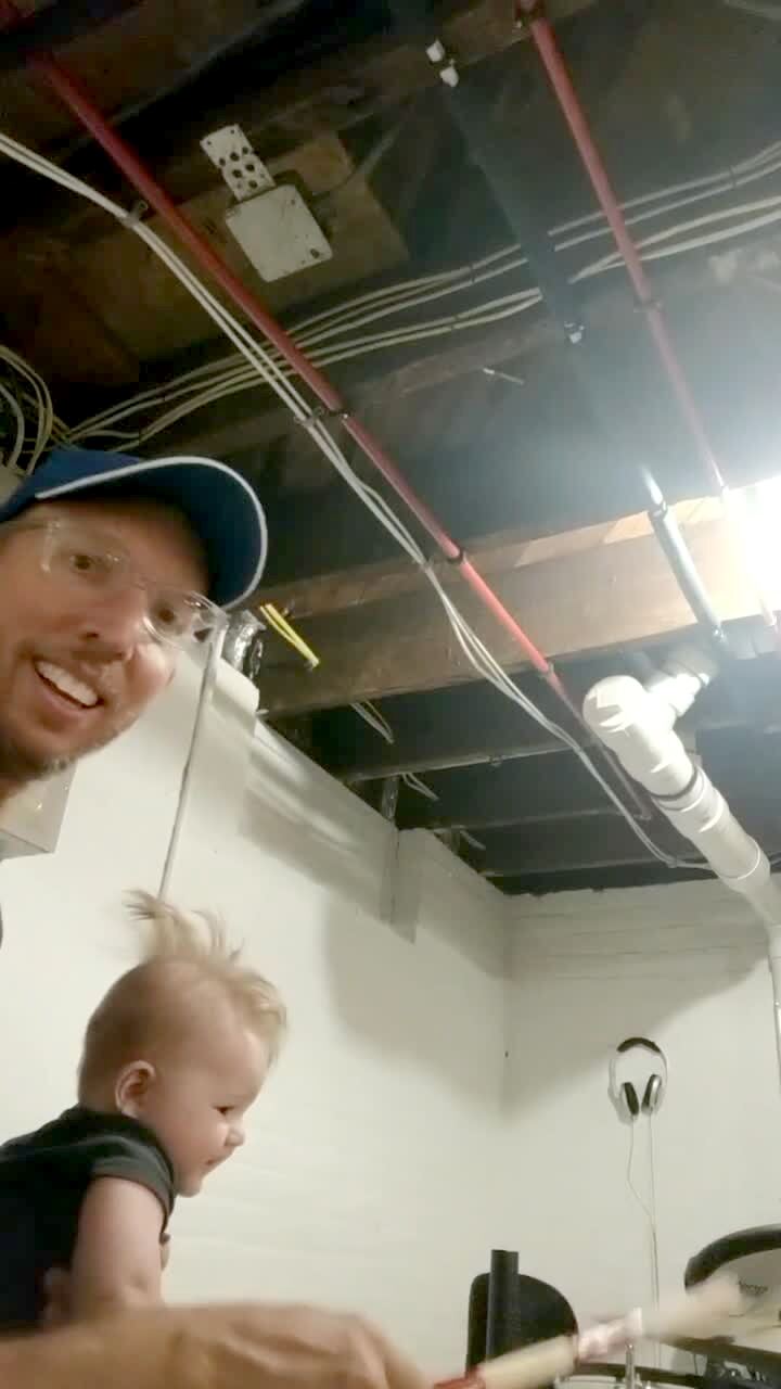 A man plays drums and the baby boy sitting in his lap giggles on the beat.