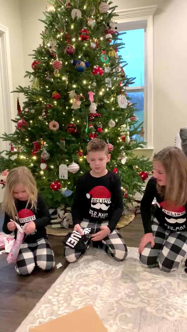A young girl, young boy, and a tot girl open themed T-shirts on Christmas morning to reveal that they will get a fourth sibling soon, and the tot girl cries.