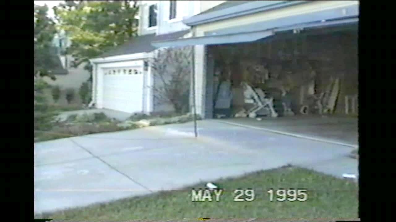 An adult man falls off a very high ladder as it collapses in a front yard. Security footage.