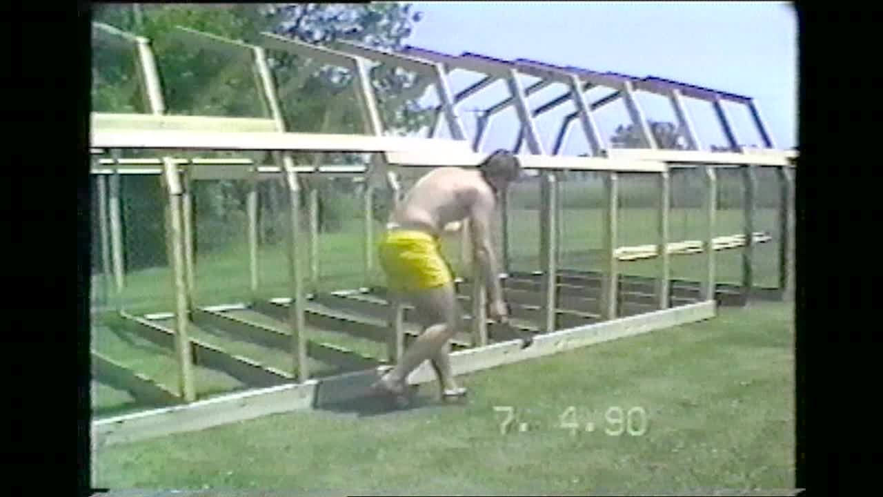 A man falls in the backyard while he climbs down a ladder. Security footage.