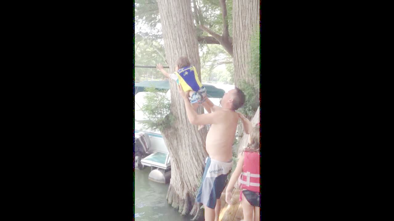 A young boy gets stuck when he tries to jumps off of a rope swing, then flips and falls into a lake.