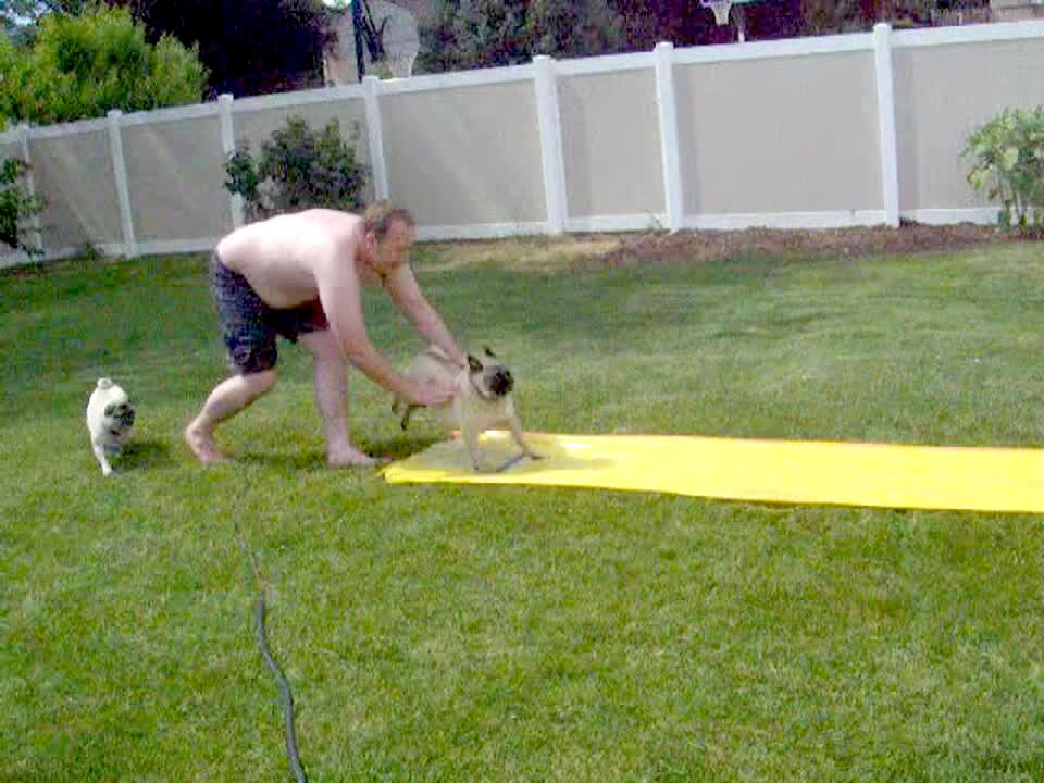 A man runs toward a slip n' slide, his pug dog runs under him, and they both slide across it.
