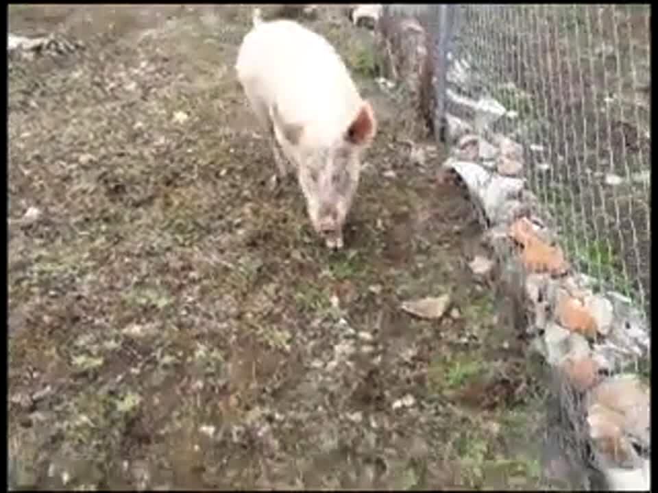 A pig snorts snot onto a woman on a farm and she screams.