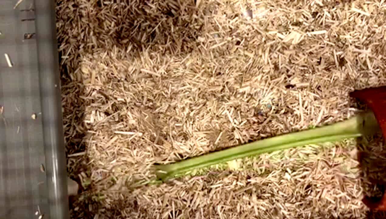 A guinea pig takes another guinea pig's cucumber slice and runs away with it.