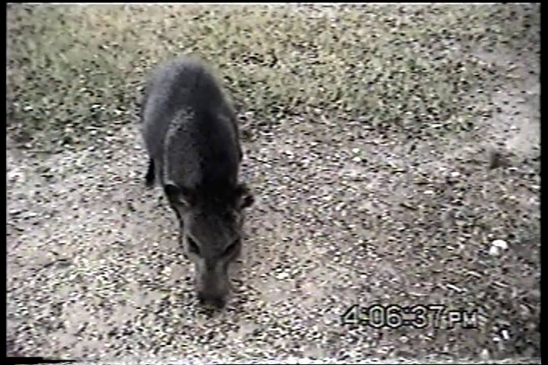 Man behind camera gets too close to wild pig eating. Pig is calm until man gets very close & calls it "gorgeous." Pig gets mad.