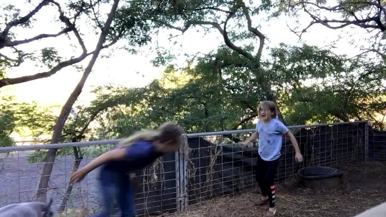 Two young girls play with pigs in a pen when one girl runs while the other climbs up the fence and falls over the side as she takes the tarp with her.
